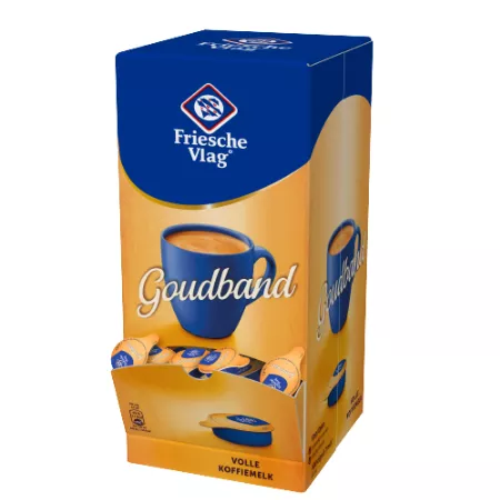 Mit friesischer Flagge Goldband Vollkaffeemilch machen Sie Ihren Kaffee köstlich cremiger und weicher Geschmack. Goudband Kaffeesahne wird aus hergestellt Vollmilch und hat eine lange Haltbarkeit. Hergestellt nach einem traditionellen Rezept. Die Goldband-Kaffeesahnebecher werden in einer stilvollen Spenderbox geliefert. Diese Box stellen Sie in die Kaffeeecke oder an die Kaffeemaschine, damit Ihre Gäste oder Kunden ihre Kaffeemilch selbst entnehmen können. In der Spenderbox sein 400 Tassen Kaffeesahne à 7ml. Die perfekte Menge für eine leckere Tasse Kaffee.
