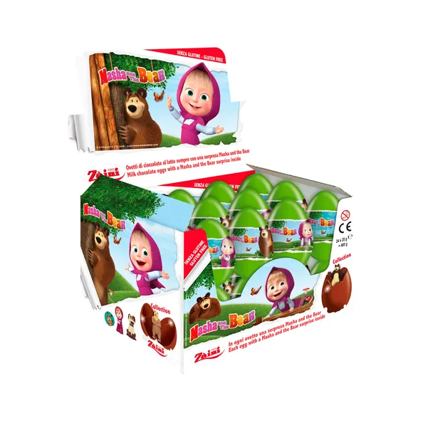 Die Schokoladeneier von Mascha und der Bär sind köstliche Milchschokoladeneier mit einem schönen Geschenk im Inneren. Die Zeichentrickserie „Mascha und der Bär“ ist bei Kindern sehr beliebt, genau wie diese Eier. Die schöne Displaybox macht auf der Theke, an der Kasse oder hinter der Bar eine gute Figur. Kaufen Sie diese Überraschungseier von Mascha und dem Bären zum Verschenken oder zum Verkauf? Dann tut es dir nicht weh! Die Displaybox enthält 24 einzeln verpackte Schokoladen-Überraschungseier von 20 Gramm. Schauen Sie sich auch die anderen an Schokoladen-Überraschungseier in unserem Sortiment.