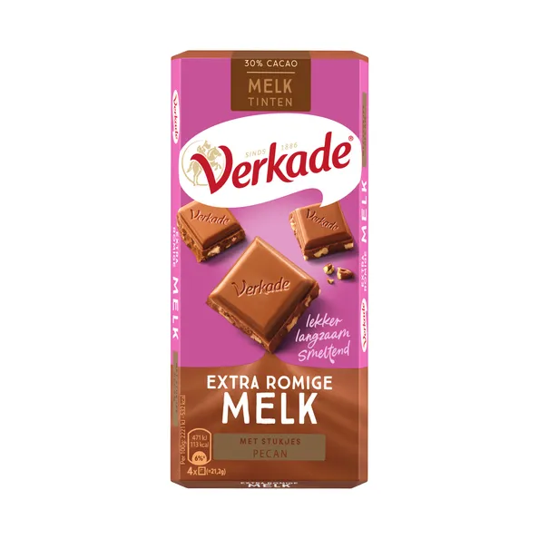 Extra cremige Milchschokolade, die langsam auf der Zunge zergeht, mit knackigen Pekannussstückchen.