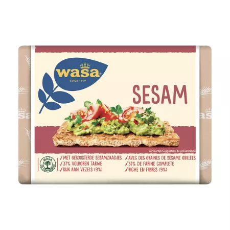 Wasa Sesam ist ein luftiges und knuspriges Weizenknäckebrot, bedeckt mit gerösteten Sesamkörnern.