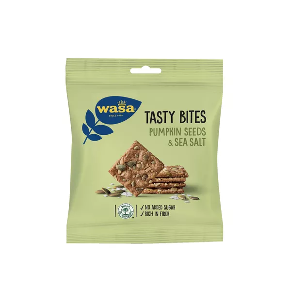Wasa Tasty Bites Kürbiskerne & Meersalz sind kleine, leckere und knusprige Knäckebrot-Snacks von Wasa. Ideal als Snack, zum Frühstück oder Mittagessen. Die kleinen Knäckebrote schmecken intensiv nach Kürbiskernen und Meersalz, werden aus Roggenvollkornmehl hergestellt und enthalten über 15 % Ballaststoffe. Außerdem wurde kein Zucker hinzugefügt und sie befinden sich in einer recycelbaren Verpackung. Das ist nachhaltiges und verantwortungsvolles Naschen! Wasa Tasty Bites sind der ideale Snack für unterwegs, auf der Arbeit oder zu Hause. Natürlich können Sie die verantwortungsbewussten Snacks von Wasa zu einem erschwinglichen Preis beim Online-Großhändler Compliment.nl kaufen. Sie kaufen Wasa Tasty Bites Kürbis Meersalz pro Karton mit 13 handliche Portionsbeutel à 50 Gramm. Wasa Leckerbissen sind eine verantwortungsvolle Ergänzung des Snack-Sortiments in Ihrem Automaten, Ihrer Kantine oder Ihrem Betriebsrestaurant.